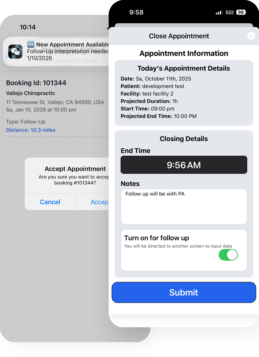 Get notified the second a new appointment matching your languages is available. When the job is done, closing out is a frictionless process.